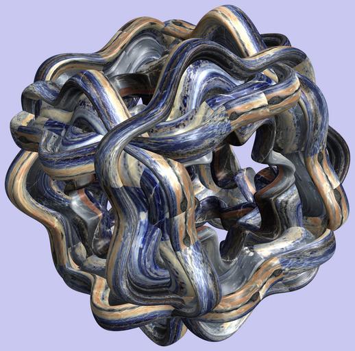 Keywords: mathematica 3d cg parametricplot3d texture torus code program algorithm プログラム コード アルゴリズム 輪環 りんかん ドーナツ どーなつ トーラス とーらす mapping テクスチャ マッピング 模様 もよう abstract 抽象 ちゅうしょう アブストラクト design pattern デザイン パターン graphic グラフィック グラフィクス structure 意匠 構造 symmetry 対称性 たいしょうせい シンメトリー 対称 たいしょう white background vehicle motorcycle bike drawing indoor surreal a = 7; (* center hole size of a torus *) b1 = 7;(* the number of angles *) b2 = 3;(* the number of waves *) c = 6; (* distance from the center of rotation *) d = 6; (* the number of tori *) h1 = 3; (* width of a torus *) h2 = 1; (* width of a torus *) SetOptions[ParametricPlot3D, PlotRange -> Full, Mesh -> None, Boxed -> False, Axes -> None, PlotPoints -> 500, ImageSize -> 3000, Background -> RGBColor[{200, 200, 240}/255], PlotStyle -> Directive[Specularity[White, 70], Texture[Import["D:/tmp/94.jpg"]]], TextureCoordinateFunction -> ({#4, #5 Pi} &), Lighting -> "Neutral"]; x = (a - h1 Cos[t] + h2 Sin[b1 s]) Cos[s + Pi/(2 b1)]; y = (a - h1 Cos[t] + h2 Sin[b1 s]) Sin[s + Pi/(2 b1)]; z = Sin[b2 t] + c; vc = {{0, 0, 1}, {0, 0, -1}, {0, 1, 0}, {0, -1, 0}, {1, 0, 0}, {-1, 0, 0}}; rm = Table[{x, y, z}.RotationMatrix[{{0, 0, 1}, vc[[i]]}], {i, d}]; ParametricPlot3D[rm, {t, 0, 2 Pi}, {s, 0, 2 Pi}] (*--- The Texture *) a = 7; (* center hole size of a torus *) b1 = 7;(* the number of angles *) b2 = 3;(* the number of waves *) c = 6; (* distance from the center of rotation *) d = 6; (* the number of tori *) h1 = 3; (* width of a torus *) h2 = 1; (* width of a torus *) SetOptions[ParametricPlot3D, PlotRange -> Full, Mesh -> None, Boxed -> False, Axes -> None, PlotPoints -> 500, ImageSize -> 3000, Background -> RGBColor[{200, 200, 240}/255], PlotStyle -> Directive[Specularity[White, 70], Texture[Import["D:/tmp/94.jpg"]]], TextureCoordinateFunction -> ({#4, #5 Pi} &), Lighting -> "Neutral"]; x = (a - h1 Cos[t] + h2 Sin[b1 s]) Cos[s + Pi/(2 b1)]; y = (a - h1 Cos[t] + h2 Sin[b1 s]) Sin[s + Pi/(2 b1)]; z = Sin[b2 t] + c; vc = {{0, 0, 1}, {0, 0, -1}, {0, 1, 0}, {0, -1, 0}, {1, 0, 0}, {-1, 0, 0}}; rm = Table[{x, y, z}.RotationMatrix[{{0, 0, 1}, vc[[i]]}], {i, d}]; ParametricPlot3D[rm, {t, 0, 2 Pi}, {s, 0, 2 Pi}] (*--- The Texture *) |