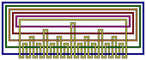 Keywords: 6Loops-Brunnian-link.svg 6-loop Brunnian link ” no two loops are directly linked but all six are collectively linked and cutting any loop frees all the other loops The abstract pattern of crossings derives from an illustration in Hermann Brunn's 1892 article à ber Verkettung by way of Dale Rolfsen's 1976 book Knots and Links p 67 The specific visual appearance of this image is quite different from those illustrations <br> Converted from the following vector PostScript source code <pre> /l lineto def 5 400 translate 875 dup scale 16 16 translate 16 16 scale 25 setlinewidth/s gsave 0 setgray 5 setlinewidth stroke grestore def/S closepath s def 0 1 moveto 41 1 l 41 16 l 0 16 l S 0 0 1 setrgbcolor stroke 1 3 moveto 40 3 l 40 15 l 1 15 l S 0 6 0 setrgbcolor stroke 2 5 moveto 39 5 l 39 14 l 2 14 l S 1 6 0 setrgbcolor stroke 3 7 moveto 38 7 l 38 13 l 3 13 l S 8 0 0 setrgbcolor stroke 4 9 moveto 37 9 l 37 12 l 4 12 l S 9 0 75 setrgbcolor stroke 5 0 moveto 6 0 l 6 4 l 7 4 l 7 0 l 8 0 l 8 6 l 9 6 l 9 0 l 10 0 l 10 4 l 11 4 l 11 0 l 12 0 l 12 8 l 13 8 l 13 0 l 14 0 l 14 4 l 15 4 l 15 0 l 16 0 l 16 6 l 17 6 l 17 0 l 18 0 l 18 4 l 19 4 l 19 0 l 20 0 l 20 10 l 21 10 l 21 0 l 22 0 l 22 4 l 23 4 l 23 0 l 24 0 l 24 6 l 25 6 l 25 0 l 26 0 l 26 4 l 27 4 l 27 0 l 28 0 l 28 8 l 29 8 l 29 0 l 30 0 l 30 4 l 31 4 l 31 0 l 32 0 l 32 6 l 33 6 l 33 0 l 34 0 l 34 4 l 35 4 l 35 0 l 36 0 l 36 11 l 5 11 l S 95 95 0 setrgbcolor stroke 5 5 1 moveto 7 5 1 l 9 5 1 moveto 11 5 1 l 13 5 1 moveto 15 5 1 l 17 5 1 moveto 19 5 1 l 21 5 1 moveto 23 5 1 l 25 5 1 moveto 27 5 1 l 29 5 1 moveto 31 5 1 l 33 5 1 moveto 35 5 1 l s 0 0 1 setrgbcolor stroke 6 5 3 moveto 10 5 3 l 14 5 3 moveto 18 5 3 l 22 5 3 moveto 26 5 3 l 30 5 3 moveto 34 5 3 l s 0 6 0 setrgbcolor stroke 8 5 5 moveto 16 5 5 l 24 5 5 moveto 32 5 5 l s 1 6 0 setrgbcolor stroke 12 5 7 moveto 28 5 7 l s 8 0 0 setrgbcolor stroke 20 5 9 moveto 36 5 9 l s 9 0 75 setrgbcolor stroke showpage EOF</pre> 2009 in this form AnonMoos based on publicly-available information thumb center Version of the Borromean rings drawn in this style 6 component links Brunnian links Images with PostScript source code Knots and links on transparent background |