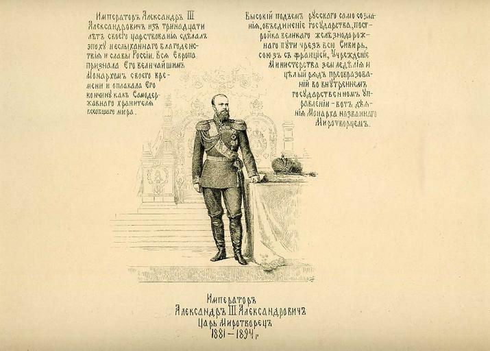 | Keywords: 70 History of the Russian state in the image of its sovereign rulers.jpg ru Импе ато Александ III Александ ович 1881-1894 г <br>Импе ато Александ III Александ ович из т инадцати лет своего ца ствования сделал эпоху неслыханного благоденствия и славы России Вся Ев опа п изнала Его величайшим она хом своего в емени и оплакала Его кончину как Самоде жавного х анителя всеобщего ми а Высокий подъем усского самосознания объединение госуда ства пост ойка великого железнодо ожного пути че ез всю Сиби ь союз с Ф анцией Уч еждение инисте ства земледелия и целый яд п еоб азований во внут еннем госуда ственном уп авлении - вот деяния она ха названного и отво цем full 70 History of the Russian state in the image of its sovereign rulers - fragment jpg Alexander III of Russia in engravings |