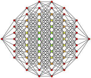 Keywords: 7-cube column graph.svg hypercube hepteract graph This hypercube graph is an orthogonal projection This oriented projection shows columns of vertices positioned a vertex-edge-vertex distance from one vertex on the left to one vertex on the right and edges attaching adjacent columns of vertices The number of vertices in each column represents rows in Pascal's triangle being 1 7 21 35 21 7 1 in the case of a 7-cube Note Starting with the tesseract the orthogonal projection shows vertices overlapping The counts of vertices at each 2d location are represented by colors red 1 orange 2 yellow 3 yellow-green 4 green 5 own Geoff Richards Qef 2008-07-23 Old bitmap version en Image 7-cube column graph gif Source code See en User Qef/Orthographic hypercube diagrams Qef Hypercube graphs 7 2-fold rotational symmetry Geometry images with dihedral symmetry 02 |