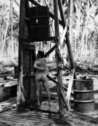Keywords: blackandwhite monochrome outdoor black and white 80-G-27197: Guadalcanal Campaign, August 1942 to February 1943. A A U.S. Marine indulges in one of Guadalcanal’s greatest luxuries – a turn under the shower bath, made from an oil drum and a block and tackle, November 23, 1942. Official U.S. Navy photograph, now in the collections of the National Archives. (2016/12/06). 80-G-27197: Guadalcanal Campaign, August 1942 to February 1943. A A U.S. Marine indulges in one of Guadalcanal’s greatest luxuries – a turn under the shower bath, made from an oil drum and a block and tackle, November 23, 1942. Official U.S. Navy photograph, now in the collections of the National Archives. (2016/12/06). |