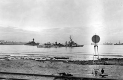 | Keywords: 80-G-30649: North African Invasion, November 1942. French destroyer Albatros beached off Casablanca, Morocco on 4 December 1942. Beyond her stern is the French light cruiser Primauguet. Both ships were badly damaged during the Battle of Casablanca, 8 November 1942. Albatros' third smokestack has been destroyed and Primaguet is largely burned out forward. Note the railroad line and signal in the foreground and shipping in the right distance, including at least two French commercial freighters and, partially visible at far right, what appears to be USS Electra (AK-21) lying very low in the water. She had been torpedoed by the German submarine U-173 on 15 November. Official U.S. Navy Photograph, now in the collections of the National Archives. 80-G-30649: North African Invasion, November 1942. French destroyer Albatros beached off Casablanca, Morocco on 4 December 1942. Beyond her stern is the French light cruiser Primauguet. Both ships were badly damaged during the Battle of Casablanca, 8 November 1942. Albatros' third smokestack has been destroyed and Primaguet is largely burned out forward. Note the railroad line and signal in the foreground and shipping in the right distance, including at least two French commercial freighters and, partially visible at far right, what appears to be USS Electra (AK-21) lying very low in the water. She had been torpedoed by the German submarine U-173 on 15 November. Official U.S. Navy Photograph, now in the collections of the National Archives. |