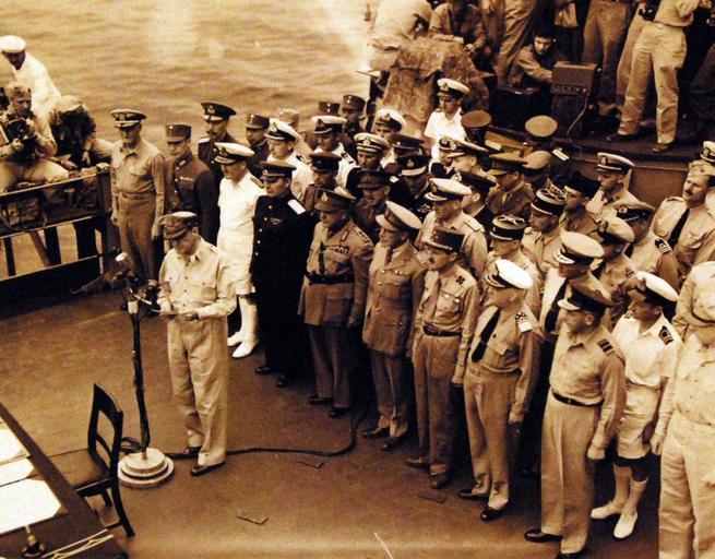 | Keywords: 80-G-332694: Surrender of Japan, Tokyo Bay, 2 September 1945. General of the Army Douglas MacArthur, Supreme Allied Commander, reading his speech to open the surrender ceremonies, on board USS Missouri (BB-63). The representatives of the Allied Powers are behind him, including (from left to right): The U.S. representative, Fleet Admiral Chester W. Nimitz, USN;Representative of China, General Hsu Yung-chang; Admiral Sir Bruce Fraser, RN, United Kingdom; Lieutenant General Kuzma Derevyanko, Soviet Union; General Sir Thomas Blamey, Australia; Colonel Lawrence Moore Cosgrave, Canada; General Jacques LeClerc, France; Admiral Conrad E.L. Helfrich, The Netherlands and Air Vice Marshall Leonard M. Isitt, New Zealand. This view is usually shown from the other side. One can possibly see the photographers of those famous images. Photographed by Lieutenant C.A. Poots. Photographed from atop Missouri's 16-inch gun turret # 2. U.S. Navy photograph, now in the collections of the National Archives. (2015/11/17). Note, the original is a very small photograph. 80-G-332694: Surrender of Japan, Tokyo Bay, 2 September 1945. General of the Army Douglas MacArthur, Supreme Allied Commander, reading his speech to open the surrender ceremonies, on board USS Missouri (BB-63). The representatives of the Allied Powers are behind him, including (from left to right): The U.S. representative, Fleet Admiral Chester W. Nimitz, USN;Representative of China, General Hsu Yung-chang; Admiral Sir Bruce Fraser, RN, United Kingdom; Lieutenant General Kuzma Derevyanko, Soviet Union; General Sir Thomas Blamey, Australia; Colonel Lawrence Moore Cosgrave, Canada; General Jacques LeClerc, France; Admiral Conrad E.L. Helfrich, The Netherlands and Air Vice Marshall Leonard M. Isitt, New Zealand. This view is usually shown from the other side. One can possibly see the photographers of those famous images. Photographed by Lieutenant C.A. Poots. Photographed from atop Missouri's 16-inch gun turret # 2. U.S. Navy photograph, now in the collections of the National Archives. (2015/11/17). Note, the original is a very small photograph. |