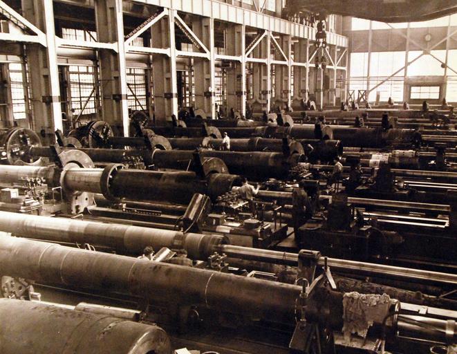 Keywords: 80-G-40986: Naval Gun Factory, Washington, Navy Yard, Washington, D.C. These huge gun barrels have reached the finishing stages of boring. With packed bits, machines are cutting away the remaining surplus steel. Photograph released March 31, 1943. Official U.S. Navy Photograph, now in the collections of the National Archives. (2016/12/20). 80-G-40986: Naval Gun Factory, Washington, Navy Yard, Washington, D.C. These huge gun barrels have reached the finishing stages of boring. With packed bits, machines are cutting away the remaining surplus steel. Photograph released March 31, 1943. Official U.S. Navy Photograph, now in the collections of the National Archives. (2016/12/20). |