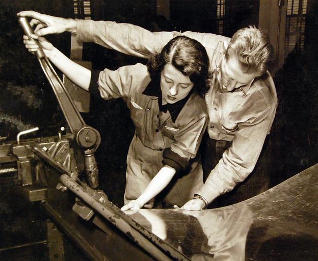 | Keywords: sculpture 80-G-42402: Naval Air Technical Training Center, Norman, Oklahoma. Working on Cornice Brake Elementary Sheet Metal Phase (6 weeks), left to right: Rachel Coffey was a stenographer with the Viscose Corp. which made rayon; AM1/C Joe Zucchi has been in the Navy for 7 years having seen duty on USS Brooklyn and at Naval Air Station, Alameda, California. Photographed: February 1943, TR 2737. Official U.S. Navy photograph, now in the collections of the National Archives. (2016/05/17). 80-G-42402: Naval Air Technical Training Center, Norman, Oklahoma. Working on Cornice Brake Elementary Sheet Metal Phase (6 weeks), left to right: Rachel Coffey was a stenographer with the Viscose Corp. which made rayon; AM1/C Joe Zucchi has been in the Navy for 7 years having seen duty on USS Brooklyn and at Naval Air Station, Alameda, California. Photographed: February 1943, TR 2737. Official U.S. Navy photograph, now in the collections of the National Archives. (2016/05/17). |