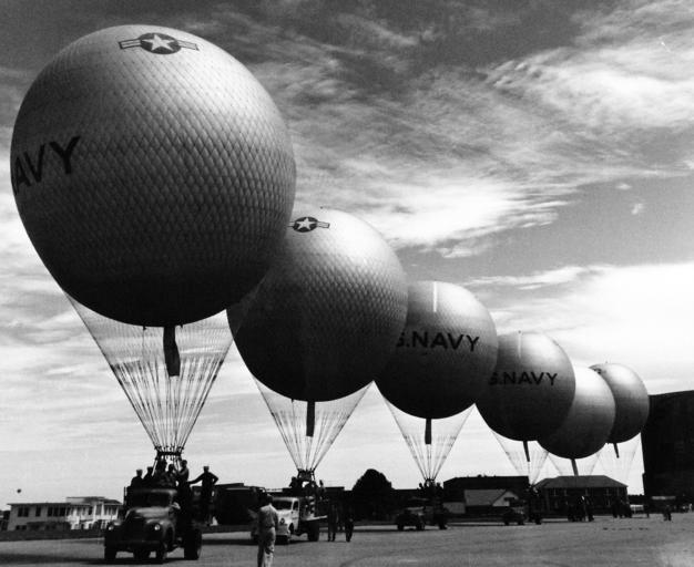 | Keywords: blackandwhite monochrome outdoor black and white 80-G-442974: Lighter-than-air pilot students at U.S. Naval Air Station, Lakehurst, New Jersey, for free balloon flight training. They are being transported to field for launching, August 23, 1949. (7/8/2015). 80-G-442974: Lighter-than-air pilot students at U.S. Naval Air Station, Lakehurst, New Jersey, for free balloon flight training. They are being transported to field for launching, August 23, 1949. (7/8/2015). | ||||