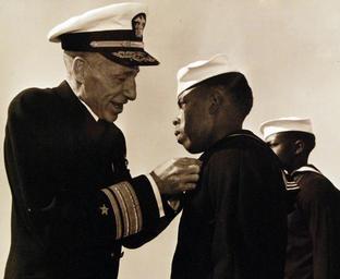 | Keywords: hat monochrome 80-G-47284: Rear Admiral Carleton H. Wright presenting the Navy and Marine Corps Medal to Seaman Second Class Effus S. Allen, USNR. Photograph filed December 9, 1944. (9/15/15) 80-G-47284: Rear Admiral Carleton H. Wright presenting the Navy and Marine Corps Medal to Seaman Second Class Effus S. Allen, USNR. Photograph filed December 9, 1944. (9/15/15) |