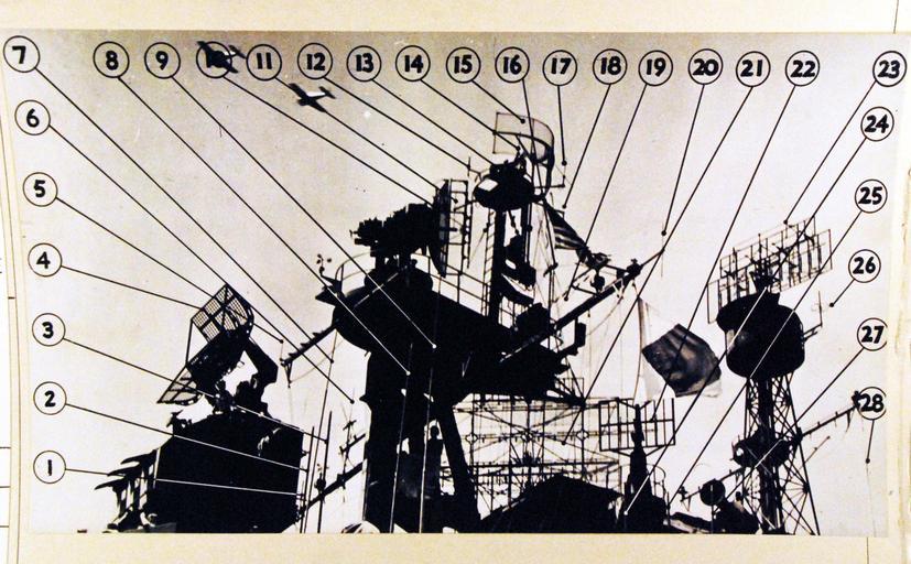 Keywords: drawing photo border 80-G-701371: Radar radio antenna installations atop USS Lexington (CVA 16), the functions of the various units in the “Bed Spring Battery” following is the key to identifying numbers. 4-Fire Control Radar; 10 – Air Search and High Finder Radar; 12- Radar Test Equipment; 13- Surface Search Radar; 15 & 22 Homing Beacon Radar; 21 & 23 Air Search Radar; 26: ID Radar. All other numbers are radio communications. Photograph released November 17, 1945. (7/8/2015). 80-G-701371: Radar radio antenna installations atop USS Lexington (CVA 16), the functions of the various units in the “Bed Spring Battery” following is the key to identifying numbers. 4-Fire Control Radar; 10 – Air Search and High Finder Radar; 12- Radar Test Equipment; 13- Surface Search Radar; 15 & 22 Homing Beacon Radar; 21 & 23 Air Search Radar; 26: ID Radar. All other numbers are radio communications. Photograph released November 17, 1945. (7/8/2015). |