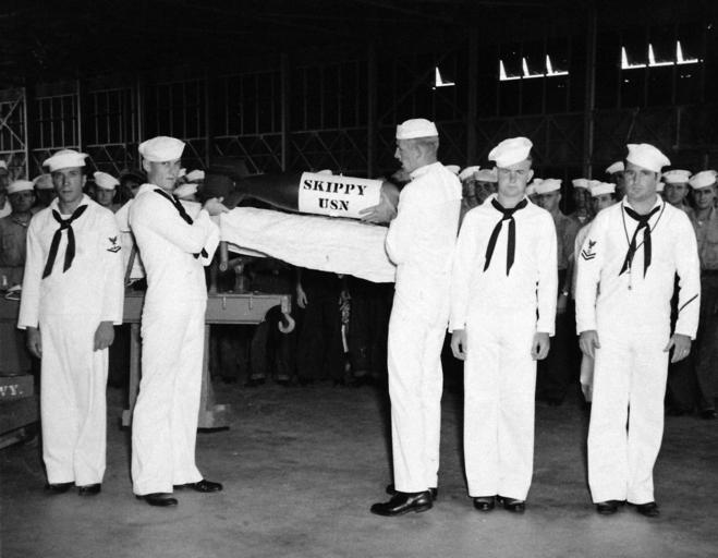 Keywords: blackandwhite monochrome black and white 80-G-82604: Naval Air Station, Banana River, Florida, September 7, 1943. Funeral services for the mascot of Hedron 12. “Skippy” encased in empty bomb shell is placed on carrier to be hauled to plane. Official U.S. Navy photograph, now in the collections of the National Archives. (2016/10/04). 80-G-82604: Naval Air Station, Banana River, Florida, September 7, 1943. Funeral services for the mascot of Hedron 12. “Skippy” encased in empty bomb shell is placed on carrier to be hauled to plane. Official U.S. Navy photograph, now in the collections of the National Archives. (2016/10/04). |