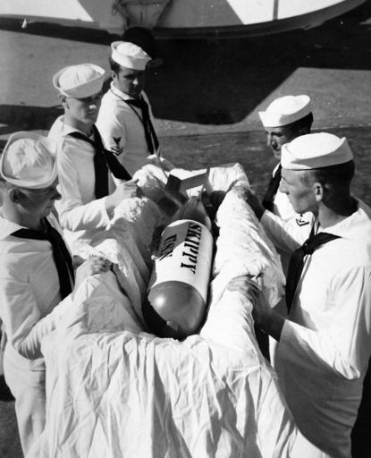 Keywords: blackandwhite monochrome black and white 80-G-82605: Naval Air Station, Banana River, Florida, September 7, 1943. Funeral services for the mascot of Hedron 12. “Skippy” encased in empty bomb shell and ready for a sea burial. Official U.S. Navy photograph, now in the collections of the National Archives. (2016/10/04). 80-G-82605: Naval Air Station, Banana River, Florida, September 7, 1943. Funeral services for the mascot of Hedron 12. “Skippy” encased in empty bomb shell and ready for a sea burial. Official U.S. Navy photograph, now in the collections of the National Archives. (2016/10/04). |