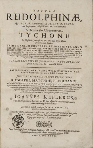 | Keywords: 8107-2Keplertp.png en Tabulae Rudolphinae quibus astronomicae scientiae temporum longuinquitate collapsae Restauratio continetur; A Phoenice illo Astronomorum Tycho Ex Illustri Generosa Braheorum in Regni Daniae familiâ oriundo Equite Jona Saurius Saur Johann Sauer Johannes; Saurius Johannes Ulm 1627 The title page of Johannes Kepler's Rudolphine Tables 1627 the most accurate and comprehensive star catalogue and planetary tables published up until that time It contained the positions of over 1000 stars and directions for locating the planets within our solar system Kepler finished the work in 1623 and dedicated it to his patron the Emperor Rudolf II but actually published it in 1627 It is the first scientific work which extensively employs the new concept of logarithms The table's findings support Kepler's laws and the theory of a heliocentric astronomy http //mathdl maa org/images/upload_library/46/Plimpton-Smith/8107-2Keplertp tif stamp Oenipontana Biblioteca Library of Innsbruck Creator Johannes Kepler 1627 PD-old-100-1923 Tabulae Rudolphinae 1627 books Frontispieces from Austria |