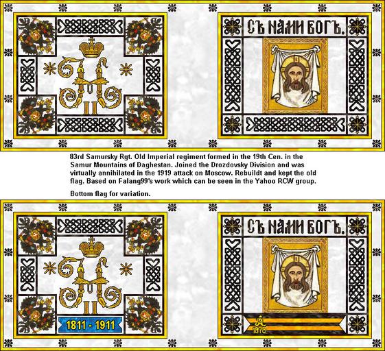 | Keywords: Знамя 83-го полка Самбурский.jpg Flag of the 83rd Samursky Regiment Знамя 83-го полка Самбу ский 1919 http //www krigsspil dk/download/download_8 html unknown other versions insignia PD-RusEmpire 83rd Samursky Regiment Military flags of Russian White Army JPG flags of Russia |