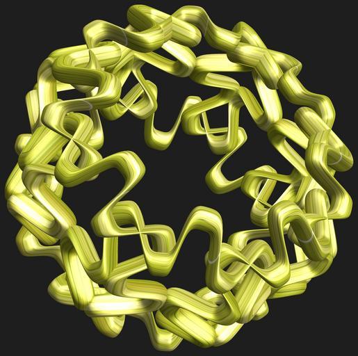 | Keywords: mathematica 3d cg parametricplot3d texture torus 輪環 りんかん ドーナツ どーなつ 八芒星 はちぼうせい 八光星 はちこうせい 八稜星 はちりょうせい code program algorithm コード プログラム アルゴリズム geometric sculpture geometricsculpture shape geometry sculpture mapping テクスチャ マッピング 模様 もよう abstract 抽象 ちゅうしょう アブストラクト design pattern デザイン パターン graphic グラフィック グラフィクス structure 意匠 構造 symmetry 対称性 たいしょうせい シンメトリー 対称 たいしょう algorithm コード indoor black background a = 8; (* center hole size of a torus *) b = 8; (* octa-torus *) c = -20; (* distance from the center of rotation *) d = 8; (* number of torus *) h = 3; (* height of a torus *) SetOptions[ParametricPlot3D, PlotRange -> Full, Mesh -> None, Boxed -> False, Axes -> False, PlotPoints -> 400, ImageSize -> 3000, Background -> RGBColor[{30, 30, 30}/255], PlotStyle -> Directive[Specularity[White, 30], Texture[Import["D:/tmp/71.jpg"]]], TextureCoordinateFunction -> ({#4 + #5, #5/Pi} &), Lighting -> "Neutral"]; f[v_] := Sin[2 Sin[Sin[Sin[v]]]]; x = (a - Cos[t] - f[b s]) Cos[s + Pi/(2 b)]; y = (a - Cos[t] - f[b s]) Sin[s + Pi/(2 b)]; z = (a - Sin[t] - h f[b s]) + c; rm = Table[{x, y, z}.RotationMatrix[2 i Pi/d, {1, 0, 0}], {i, d}]; ParametricPlot3D[rm, {t, 0, 2 Pi}, {s, 0, 2 Pi}] (*--- The Texture *) a = 8; (* center hole size of a torus *) b = 8; (* octa-torus *) c = -20; (* distance from the center of rotation *) d = 8; (* number of torus *) h = 3; (* height of a torus *) SetOptions[ParametricPlot3D, PlotRange -> Full, Mesh -> None, Boxed -> False, Axes -> False, PlotPoints -> 400, ImageSize -> 3000, Background -> RGBColor[{30, 30, 30}/255], PlotStyle -> Directive[Specularity[White, 30], Texture[Import["D:/tmp/71.jpg"]]], TextureCoordinateFunction -> ({#4 + #5, #5/Pi} &), Lighting -> "Neutral"]; f[v_] := Sin[2 Sin[Sin[Sin[v]]]]; x = (a - Cos[t] - f[b s]) Cos[s + Pi/(2 b)]; y = (a - Cos[t] - f[b s]) Sin[s + Pi/(2 b)]; z = (a - Sin[t] - h f[b s]) + c; rm = Table[{x, y, z}.RotationMatrix[2 i Pi/d, {1, 0, 0}], {i, d}]; ParametricPlot3D[rm, {t, 0, 2 Pi}, {s, 0, 2 Pi}] (*--- The Texture *) |