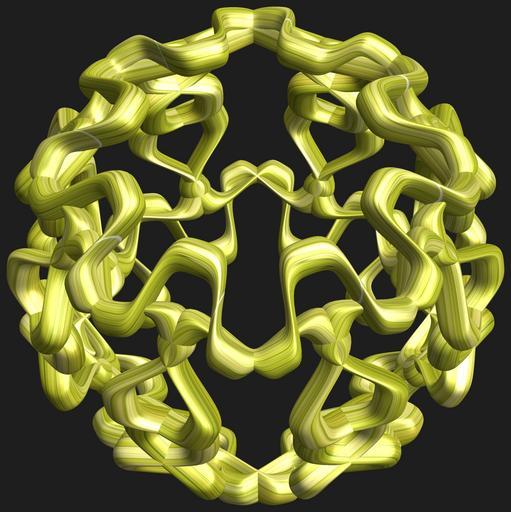 | Keywords: mathematica 3d cg parametricplot3d texture torus 輪環 りんかん ドーナツ どーなつ 八芒星 はちぼうせい 八光星 はちこうせい 八稜星 はちりょうせい code program algorithm コード プログラム アルゴリズム geometric sculpture geometricsculpture shape geometry sculpture mapping テクスチャ マッピング 模様 もよう abstract 抽象 ちゅうしょう アブストラクト design pattern デザイン パターン graphic グラフィック グラフィクス structure 意匠 構造 symmetry 対称性 たいしょうせい シンメトリー 対称 たいしょう algorithm コード black background indoor organic pattern a = 10; (* center hole size of a torus *) b = 8; (* octa-torus *) c = -20; (* distance from the center of rotation *) d = 8; (* number of torus *) h = 2; (* height of a torus *) SetOptions[ParametricPlot3D, PlotRange -> Full, Mesh -> None, Boxed -> False, Axes -> False, PlotPoints -> 400, ImageSize -> 3000, Background -> RGBColor[{30, 30, 30}/255], PlotStyle -> Directive[Specularity[White, 30], Texture[Import["D:/tmp/71.jpg"]]], TextureCoordinateFunction -> ({#4 + #5, #5/Pi} &), Lighting -> "Neutral"]; f[v_] := Sin[2 Sin[Sin[Sin[v]]]]; x = (a - Cos[t] - f[b s]) Cos[s + Pi/(2 b)]; y = (a - Cos[t] - f[b s]) Sin[s + Pi/(2 b)]; z = (a - Sin[t] - h f[b s]) + c; rm = Table[{x, y, z}.RotationMatrix[2 i Pi/d, {1, 0, 0}], {i, d}]; ParametricPlot3D[rm, {t, 0, 2 Pi}, {s, 0, 2 Pi}] (*--- The Texture *) a = 10; (* center hole size of a torus *) b = 8; (* octa-torus *) c = -20; (* distance from the center of rotation *) d = 8; (* number of torus *) h = 2; (* height of a torus *) SetOptions[ParametricPlot3D, PlotRange -> Full, Mesh -> None, Boxed -> False, Axes -> False, PlotPoints -> 400, ImageSize -> 3000, Background -> RGBColor[{30, 30, 30}/255], PlotStyle -> Directive[Specularity[White, 30], Texture[Import["D:/tmp/71.jpg"]]], TextureCoordinateFunction -> ({#4 + #5, #5/Pi} &), Lighting -> "Neutral"]; f[v_] := Sin[2 Sin[Sin[Sin[v]]]]; x = (a - Cos[t] - f[b s]) Cos[s + Pi/(2 b)]; y = (a - Cos[t] - f[b s]) Sin[s + Pi/(2 b)]; z = (a - Sin[t] - h f[b s]) + c; rm = Table[{x, y, z}.RotationMatrix[2 i Pi/d, {1, 0, 0}], {i, d}]; ParametricPlot3D[rm, {t, 0, 2 Pi}, {s, 0, 2 Pi}] (*--- The Texture *) |