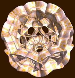 Keywords: mathematica 3d cg parametricplot3d texture torus 輪環 りんかん ドーナツ どーなつ 五芒星 ごぼうせい 五光星 ごこうせい 五稜星 ごりょうせい code program algorithm コード プログラム アルゴリズム pentagram geometric sculpture geometricsculpture shape geometry sculpture mapping テクスチャ マッピング 模様 もよう abstract 抽象 ちゅうしょう アブストラクト design pattern デザイン パターン graphic グラフィック グラフィクス structure 意匠 構造 symmetry 対称性 たいしょうせい シンメトリー 対称 たいしょう algorithm コード surreal indoor black background a = 5; (* center hole size of a torus *) b = 5; (* penta-torus *) c = 8; (* distance from the center of rotation *) d = 8; (* number of torus *) h = 1; (* height of a torus *) SetOptions[ParametricPlot3D, PlotRange -> Full, Mesh -> None, Boxed -> False, Axes -> False, PlotPoints -> 400, ImageSize -> 1600, Background -> Darker[Orange, 0.8], PlotStyle -> Directive[Specularity[White, 30], Texture[Import["D:/tmp/861.jpg"]]], TextureCoordinateFunction -> ({#4, #5 2 Pi} &), Lighting -> "Neutral"]; f[v_] := Sin[2 Sin[Sin[Sin[v]]]]; g[v_] := Sum[Cos[(2 k - 1) v]/(2 k - 1), {k, 4}]; x = (a - g[t] - f[b s]) Cos[s + 3 Pi/(4 b)] + c; y = (a - g[t] - f[b s]) Sin[s + 3 Pi/(4 b)] + c; z = (a - Sin[t] - h f[b s]); rot = Table[{x, y, z}.RotationMatrix[2 i Pi/d, {1, 1, 1}], {i, d}]; ParametricPlot3D[rot, {t, 0, 2 Pi}, {s, 0, 2 Pi}] (*--- The Texture *) a = 5; (* center hole size of a torus *) b = 5; (* penta-torus *) c = 8; (* distance from the center of rotation *) d = 8; (* number of torus *) h = 1; (* height of a torus *) SetOptions[ParametricPlot3D, PlotRange -> Full, Mesh -> None, Boxed -> False, Axes -> False, PlotPoints -> 400, ImageSize -> 1600, Background -> Darker[Orange, 0.8], PlotStyle -> Directive[Specularity[White, 30], Texture[Import["D:/tmp/861.jpg"]]], TextureCoordinateFunction -> ({#4, #5 2 Pi} &), Lighting -> "Neutral"]; f[v_] := Sin[2 Sin[Sin[Sin[v]]]]; g[v_] := Sum[Cos[(2 k - 1) v]/(2 k - 1), {k, 4}]; x = (a - g[t] - f[b s]) Cos[s + 3 Pi/(4 b)] + c; y = (a - g[t] - f[b s]) Sin[s + 3 Pi/(4 b)] + c; z = (a - Sin[t] - h f[b s]); rot = Table[{x, y, z}.RotationMatrix[2 i Pi/d, {1, 1, 1}], {i, d}]; ParametricPlot3D[rot, {t, 0, 2 Pi}, {s, 0, 2 Pi}] (*--- The Texture *) |