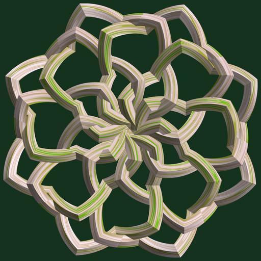 Keywords: mathematica 3d cg parametricplot3d texture torus code program algorithm プログラム コード アルゴリズム 輪環 りんかん ドーナツ どーなつ 五芒星 ごぼうせい geometric sculpture geometricsculpture shape geometry sculpture mapping テクスチャ マッピング 模様 もよう abstract 抽象 ちゅうしょう アブストラクト design pattern デザイン パターン graphic グラフィック グラフィクス structure 意匠 構造 symmetry 対称性 たいしょうせい シンメトリー 対称 たいしょう tangle a = 8; (* center hole size *) b = 5; (* penta-torus *) c = 6; (* distance from the center of rotation *) d = 8; (* number of torus *) h = 2; (* height of a torus *) SetOptions[ParametricPlot3D, PlotRange -> Full, Mesh -> None, Boxed -> False, Axes -> False, PlotPoints -> 400, ImageSize -> 3000, Background -> RGBColor[{20, 50, 30}/255], PlotStyle -> Directive[Specularity[White, 70], Texture[Import["D:/tmp/862.jpg"]]], TextureCoordinateFunction -> ({#4 + #5, #5 / Pi} &), Lighting -> "Neutral"]; f[v_] := TriangleWave[{-1, 1}, v/(2 Pi)]; g[v_] := TriangleWave[{-1, 1}, v/(2 Pi) + 1/4]; x = (a - g[t] - f[b s]) Cos[s] + c; y = (a - g[t] - f[b s]) Sin[s] + c; z = (a - f[t] - h f[b s]); rm = Table[{x, y, z}.RotationMatrix[2 i Pi/d, {0, 0, 1}], {i, d}]; ParametricPlot3D[rm, {t, 0, 2 Pi}, {s, 0, Pi}] (*--- The Texture *) a = 8; (* center hole size *) b = 5; (* penta-torus *) c = 6; (* distance from the center of rotation *) d = 8; (* number of torus *) h = 2; (* height of a torus *) SetOptions[ParametricPlot3D, PlotRange -> Full, Mesh -> None, Boxed -> False, Axes -> False, PlotPoints -> 400, ImageSize -> 3000, Background -> RGBColor[{20, 50, 30}/255], PlotStyle -> Directive[Specularity[White, 70], Texture[Import["D:/tmp/862.jpg"]]], TextureCoordinateFunction -> ({#4 + #5, #5 / Pi} &), Lighting -> "Neutral"]; f[v_] := TriangleWave[{-1, 1}, v/(2 Pi)]; g[v_] := TriangleWave[{-1, 1}, v/(2 Pi) + 1/4]; x = (a - g[t] - f[b s]) Cos[s] + c; y = (a - g[t] - f[b s]) Sin[s] + c; z = (a - f[t] - h f[b s]); rm = Table[{x, y, z}.RotationMatrix[2 i Pi/d, {0, 0, 1}], {i, d}]; ParametricPlot3D[rm, {t, 0, 2 Pi}, {s, 0, Pi}] (*--- The Texture *) |