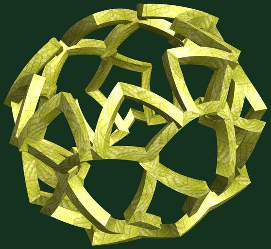 Keywords: mathematica 3d cg parametricplot3d texture torus code program algorithm プログラム コード アルゴリズム 輪環 りんかん ドーナツ どーなつ 五芒星 ごぼうせい geometric sculpture geometricsculpture shape geometry sculpture mapping テクスチャ マッピング 模様 もよう abstract 抽象 ちゅうしょう アブストラクト design pattern デザイン パターン graphic グラフィック グラフィクス structure 意匠 構造 symmetry 対称性 たいしょうせい シンメトリー 対称 たいしょう black background foliage outdoor plant ancient a = 8; (* center hole size *) b = 5; (* penta-torus *) c = -18; (* distance from the center of rotation *) d = 8; (* number of torus *) h = 2; (* height of a torus *) SetOptions[ParametricPlot3D, PlotRange -> Full, Mesh -> None, Boxed -> False, Axes -> False, PlotPoints -> 400, ImageSize -> 3000, Background -> RGBColor[{20, 50, 30}/255], PlotStyle -> Directive[Specularity[White, 30], Texture[Import["D:/tmp/71.jpg"]]], TextureCoordinateFunction -> ({#4, #5 Pi} &), Lighting -> "Neutral"]; f[v_] := TriangleWave[{-1, 1}, v/(2 Pi)]; g[v_] := TriangleWave[{-1, 1}, v/(2 Pi) + 1/4]; x = (a - g[t] - f[b s]) Cos[s + 3 Pi/(4 b)]; y = (a - g[t] - f[b s]) Sin[s + 3 Pi/(4 b)]; z = (a - f[t] - h f[b s]) + c; rm = Table[{x, y, z}.RotationMatrix[2 i Pi/d, {1, 1, 0}], {i, d}]; ParametricPlot3D[rm, {t, 0, 2 Pi}, {s, 0, Pi}] (*--- The Texture *) a = 8; (* center hole size *) b = 5; (* penta-torus *) c = -18; (* distance from the center of rotation *) d = 8; (* number of torus *) h = 2; (* height of a torus *) SetOptions[ParametricPlot3D, PlotRange -> Full, Mesh -> None, Boxed -> False, Axes -> False, PlotPoints -> 400, ImageSize -> 3000, Background -> RGBColor[{20, 50, 30}/255], PlotStyle -> Directive[Specularity[White, 30], Texture[Import["D:/tmp/71.jpg"]]], TextureCoordinateFunction -> ({#4, #5 Pi} &), Lighting -> "Neutral"]; f[v_] := TriangleWave[{-1, 1}, v/(2 Pi)]; g[v_] := TriangleWave[{-1, 1}, v/(2 Pi) + 1/4]; x = (a - g[t] - f[b s]) Cos[s + 3 Pi/(4 b)]; y = (a - g[t] - f[b s]) Sin[s + 3 Pi/(4 b)]; z = (a - f[t] - h f[b s]) + c; rm = Table[{x, y, z}.RotationMatrix[2 i Pi/d, {1, 1, 0}], {i, d}]; ParametricPlot3D[rm, {t, 0, 2 Pi}, {s, 0, Pi}] (*--- The Texture *) |