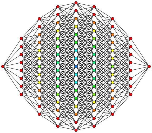 | Keywords: 8-cube column graph.svg 8-hypercube octeract graph This hypercube graph is an orthogonal projection This oriented projection shows columns of vertices positioned a vertex-edge-vertex distance from one vertex on the left to one vertex on the right and edges attaching adjacent columns of vertices The number of vertices in each column represents rows in Pascal's triangle being 1 8 28 56 70 56 28 8 1 in the case of a 8-cube Note Starting with the tesseract the orthogonal projection shows vertices overlapping The counts of vertices at each 2d location are represented by colors red orange yellow green etc own Geoff Richards Qef 2008-07-23 Old bitmap version en Image 8-cube column graph gif Source code See en User Qef/Orthographic hypercube diagrams Qef Hypercube graphs 8 2-fold rotational symmetry Geometry images with dihedral symmetry 02 |