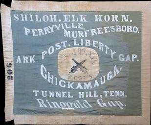 Keywords: 8th and 19th Combined Arkansas Infantry Regiment.jpg en Flag of the 8th and 19th Consolidated Arkansas Infantry Regiments Flag is another example of the 1864 issue of Hardee flags This was produced and decorated specifically for the combined unit displaying battle honors of each The poorly dyed blue field now faded to pea green is typical of the 1864 flags When it was captured at Jonesboro Georgia on 1 September 1864 the flag was identified as that of an artillery battery The honor of crossed cannon as well as the unit's position supporting Key's Battery caused the confused attribution Hardee Battle flag pattern Cleburne's Division 1864 issue Cotton with black and white paint 35 x 34 1/2 remaining War Department Capture Number 206 Currently located at the Old State House Museum Little Rock Arkanas 2011-10-20 http //www oldstatehouse com/collections/flags/flagDetail asp g 3 img 4 Confederate Army 1864 PD-Art Uploaded with UploadWizard Arkansas in the American Civil War Army flags of the Confederate States of America Military in Arkansas |