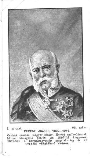 Keywords: 95. Ferenc József.jpg hu A felvétel szkennelés 2012 június 7 én készült A képeslapsorozat korábbi tulajdonosa Bálint János Ócsa volt Az I sor 1 sz 1 sorozat 100 szám jelzetű képeslapok a 101 jelzetű füst albumot töltötték meg A képeslap sorozat képeit az 1920 as években adták ki Az ismeretlen szerző halála óta több mint 70 év telt el A képeslapok hátoldalán ex libris A sorozat képei 1 sz Gróf Széchenyi István 1791 1860 2 sz Deák Ferenc 1803 1876 2 sz 3 sz 4 sz 5 sz 6 sz 7 sz Felsőbükki Nagy Pál 1777 1857 8 sz Báró Eötvös József 1813 1871 9 sz Kossuth Lajos 1802 1894 10 sz Petőfi Sándor 1823 1849 11 sz Liszt Ferenc 1811 1886 12 sz Batthányy Lajos gróf 1806 1849 13 sz II Lajos 1506 1526 14 sz Munkácsy Mihály 1844 1900 15 sz Tisza Kálmán gróf 1830 1902 16 sz Mátyás király 1440 1490 17 sz Arany János 1817 1882 18 sz Tisza István gróf 1865 1918 19 sz Kölcsey Ferenc 1790 1838 20 sz Szinyei Merse Pál 1845 1920 21 sz Jókai Mór 1825 1904 22 sz Mikszáth Kálmán 1849 1910 23 sz Vörösmarty Mihály 1800 1855 24 sz Fadrusz János 1858 1903 25 sz Árpád a Honalapító 26 sz Szent István 975 -1038 27 sz Szent László 1040 - 1095 28 sz Könyves Kálmán 1070 1116 29 sz II Endre 1205 1235 30 sz IV Béla 1206 1270 31 sz Nagy Lajos 32 sz Hunyadi János 33 sz II Rákóczi Ferenc 34 sz Vak Bottyán 35 sz III Károly 36 sz II József 37 sz Madách Imre 38 sz Katona József 39 sz Csokonai Vitéz Mihály 40 sz Lotz Károly 41 sz Pöltenberg Ernő 42 sz Török Ignác 43 sz 44 sz 45 sz 46 sz 47 sz Aulich Lajos 48 sz Damjanich János 49 sz Dessewffy Arisztid 50 sz Lázár Vilmos 51 sz Kiss Ernő 52 sz Schweidel József 53 sz Vécsey Károly 54 sz Táncsics Mihály 55 sz Tompa Mihály 56 sz Rottenbiller Lipót 57 sz Szent Gellért 58 sz Szent Imre 59 sz Kapisztrán János 60 sz Kinizsi Pál 61 sz Tomori Pál 62 sz Zrinyi Miklós 63 sz Gábor Áron 64 sz Bem József 65 sz Bocskay István 66 sz Bethlen Gábor 67 sz József nádor 68 sz Kisfaludy Károly 69 sz Berzsenyi Dániel 70 sz Fáy András 71 sz Semmelweis Ignác 72 sz Egressy Gábor 73 sz Erkel Ferenc 74 sz Szilágyi Dezső 75 sz báró Bánffy Dezső 76 sz Ujházi Ede 77 sz Baross Gábor 78 sz id Wekerle Sándor 79 sz Justh Gyula 80 sz Prohászka Ottokár 81 sz Reményi Ede 82 sz Vámbéry Ármin 83 sz Rákosi Jenő 84 sz Eötvös Károly 85 sz Benczur Gyula 86 sz Blaha Lujza 87 sz Jászai Mari 88 sz Gárdonyi Géza 89 sz Ady Endre 90 sz Gyóni Géza 91 sz Báthori Zsigmond 92 sz Pázmány Péter 93 sz Kisfaludy Sándor 94 sz Goldmark Károly 95 sz Ferenc József 96 sz Erzsébet 97 sz Hermann Ottó 98 sz Lechner Ödön 99 sz Pósa Lajos 100 sz Móra Ferenc 101 jelzet füst album A felvétel és az egész sorozat képei megjelentek Creative Commons alatt a Metapolisz DVD sorozatban 2012-06-07 saját tulajdon author Custom license marker 2012 06 07 PD-old Metapolisz Uploaded with UploadWizard Franz Joseph I of Austria in art |