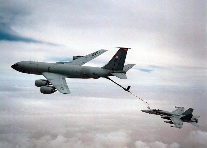 | Keywords: 960424-N-1991K-001 Air To Air Refueling.jpg en 960424-N-1991K-001 A U S Air Force KC-135 tanker refuels a U S Navy F/A-18C Hornet from the Wildcats of Strike Fighter Squadron One Three One in the skies over Saudi Arabia on April 24 1996 The Hornet was operating from the flight deck of U S Navy aircraft carrier USS George Washington CVN 73 and was preparing to fly a patrol mission enforcing the no-fly zone over southern Iraq Commanded by Capt Malcolm P Branch the George Washington is currently deployed to the Arabian Gulf in suppport of Operation Southern Watch U S Navy photo by Lt Stephen Kay Released 960424-N-1991K-001 Navy http //www navy mil/view_image asp id 406 U S Navy photo by Lt Stephen Kay PD-USGov-Military-Navy Aerial refueling by KC-135 Stratotanker Aerial refueling of F/A-18C Hornet |
