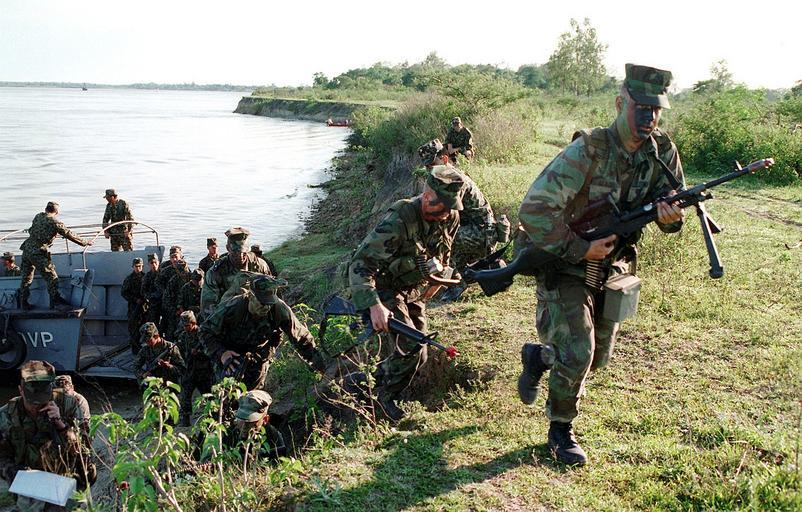 Keywords: 961006-N-1030S-002 UNITAS Training.jpg en 961006-N-1030S-002 Lance Corporal Matthew Gladden right leads the Marines from the II Marine Expeditionary Force MEF MAR for UNITAS ashore during amphibious landing excercises in phase 6 of UNITAS 37-96 Lance Corporal Gladden a native from Erie Pennsylvania took part in the joint exercise in Paraguay The Marine detachment conducted training evolutions in weapon familiarization amphibious assault insertion and tactics with members of the Paraguayan Marines UNITAS is an annual operation in which a U S Navy task group conduct combined exercises with participating navies The task group for UNITAS 37-96 include the frigate USS John L Hall FFG 32 tank landing ship USS La Moure County LST 1194 and the attack submarine USS Narwhal SSN 671 U S Navy photo by James Slaughenhaupt Released 1996-10 961006-N-1030S-002 Navy http //www navy mil/view_image asp id 422 en U S Navy photo by James Slaughenhaupt PD-USGov-Military-Navy UNITAS 37-96 M16 rifle with blank-firing adaptor M-240 machine gun Camouflage facepainting 1996 in Paraguay 1996 photographs Military people in 1996 Battle Dress Uniform in 1996 Male soldiers People of the United States in 1996 Utility covers Men facing right and looking at viewer October 1996 Personality rights