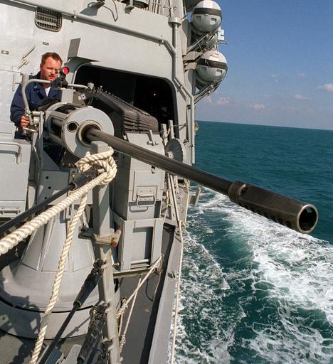 | Keywords: 971121-N-1434K-003 Chain Gun.jpg en 971121-N-1434K-003 November 21st 1997 On board the destroyer USS Benfold DDG 65 operating in the Northern Persian Gulf Gunner's Mate Guns 1st Class Joe Brown from Arlington Texas mans a 25mm chain gun while on watch in the Persian Gulf The ship home ported in San Diego California is currently deployed with the aircraft carrier USS Nimitz CVN 68 battle group under the U S Navy s Fifth Fleet Benfold is currently conducting Multinational Maritime Interception Operations as part of the UN sanctions against Iraq U S Navy photo by Photographer s Mate 2nd Class Rebecca Kearns Released 1997-11-21 971121-N-1434K-003 Navy http //www navy mil/view_image asp id 463 U S Navy photo by Photographer s Mate 2nd Class Rebecca Kearns PD-USGov-Military-Navy Mk 38 25mm chain gun Aboard USS Benfold DDG-65 |