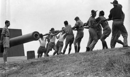 | Keywords: 9.2 inch coast defence gun Australia WWII.jpeg Cleaning out bore of gun after firing RAA Shows soldiers pulling cleaning wad through gun barrel <br> Comment This is a 9 2 inch coast defence gun somewhere in Australia Series/Collection Argus newspaper collection of war photographs World War II SLVIC-digitalimage 188814 H99 201/3164 1940 not stated PD-Australia BL 9 2 inch Mk IX - X coast defence gun World War II defence of Australia Gun cleaning | ||||