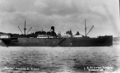 | Keywords: A-01556 Hvalkokeri MAUDIE.jpg en A/S Hvalen's whaling factory Maudie 1920 Vestfold Fylkesmuseum Digitalt bildearkiv http //www vfm no/fotoarkiv/ Creator Ansgar Theodor Larsen 1927 PD-old Whaling factory ships Steamships of Norway Ships built in the United Kingdom 1920s ships Photographs by Ansgar Theodor Larsen Black and white photographs of ships 1927 photographs Black and white photographs of Norway Whaling in Tønsberg | ||||