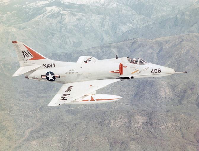 | Keywords: A-4E Skyhawk Lady Jessie VA-164 in flight 1966.jpeg A U S Navy Douglas A-4E Skyhawk BuNo 152048 Lady Jessie pilot LCdr R C Perry from Attack Squadron VA-164 Ghost Riders in flight VA-164 was assigned to Carrier Air Wing 16 CVW-16 aboard the aircraft carrier USS Oriskany CVA-34 for a deployment to Vietnam from 26 May to 16 November 1966 <br>LCdr Perry was shot down and killed by a SAM on 31 October 1967 while flying A-4E 151991 side number AH-407 The A-4E 152048 was shot down by ground fire over North Vietnam on 18 October 1967 while in service with VA-164 The pilot LCdr Barr was also killed http //collections naval aviation museum/emuwebdoncoms/pages/doncoms/AdvQuery php U S Navy National Museum of Naval Aviation photo No http //collections naval aviation museum/emuwebdoncoms/pages/doncoms/Display php irn 50486 QueryPage 2Femuwebdoncoms 2Fpages 2Fdoncoms 2FAdvQuery php 2011 003 237 009 1966 U S Navy PD-USGov-Military-Navy A-4E Skyhawk Attack Squadron 164 United States Navy |