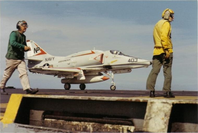 Keywords: A-4F VA-164 CVA-19.jpg en A McDonnell Douglas A-4F Skyhawk aircraft of attack squadron VA-164 Ghost Riders Attack Carrier Air Wing 21 CVW-21 after having just returned from a bombing mission over Vietnam to the aircraft carrier USS Hancock CVA-19 in the early 1970s The flight deck crew member in the green shirt belongs to the catapult and arresting gear crews the one in the yellow shirt to the officers responsible for aircraft handling catapult and arresting gear or plane directing US Navy sailor or employee http //virtualcruisebooks com/v-web/gallery/Cruise-Photos-1970-1973 2C-by-Peter-Sakaris/A_4_2 1970-1973 Peter Sakaris PD-USGov-Military-Navy A-4F Skyhawk Attack Squadron 164 United States Navy Aboard USS Hancock CV-19 Aviation in the 1970s |