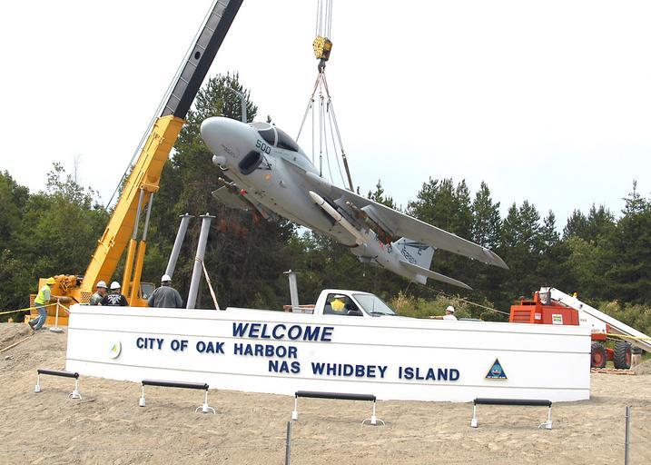 Keywords: A-6 Intruder on Display DVIDS102372.jpg en An A-6 Intruder is lowered by a crane into place at the gateway display on Highway 20 at the north end of the city More than 50 Sailors and civilians from Naval Air Station Whidbey Island volunteered their time to rehabilitate and paint the aircraft for its use as a display 2007-06-28 https //www dvidshub net/image/102372 070628-N-+++++-005 2008-07-12 09 14 OAK HARBOR WA US PD-USGov-Military-Navy Naval Air Station Whidbey Island Images from DoD uploaded by Fæ |