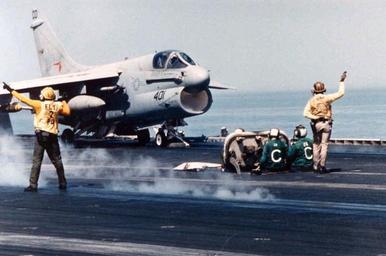 | Keywords: A-7E VA-94 on cat of USS Enterprise (CVN-65) 1988.jpeg An armed U S Navy LTV A-7E Corsair II from Attack Squadron VA-94 Shrikes is lauched from the aircraft carrier USS Enterprise CVN-65 during Operation Praying Mantis on 18 April 1988 in the Persian Gulf VA-94 was assigned to Carrier Air Wing 11 CVW-11 aboard the Big E for a deployment to the Western Pacific and the Indian Ocean from 5 January to 3 July 1988 http //collections naval aviation museum/emuwebdoncoms/pages/doncoms/AdvQuery php U S Navy National Museum of Naval Aviation photo No http //collections naval aviation museum/emuwebdoncoms/pages/doncoms/Display php irn 6366 QueryPage 2Femuwebdoncoms 2Fpages 2Fdoncoms 2FAdvQuery php 1996 253 7073 022 1988-04-18 U S Navy PD-USGov-Military-Navy A-7E Corsair II Strike Fighter Squadron 94 United States Navy USS Enterprise CVN-65 flight deck Operation Praying Mantis |