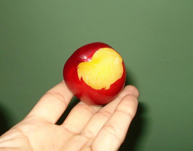 Keywords: A bitten red plum.jpg en A picture of a bitten red plum took by myself Own Jchahin13 2009-06-12 Prunus sect Prunus People with plums Half-eaten