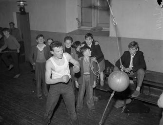 | Keywords: A boxing school established in Llanarmon by W G Buchanan, an ex-air force boxing champion, and the Rev T D Williams (15162039803).jpg Teitl Cymraeg/Welsh title Ysgol focsio a sefydlwyd yn Llanarmon gan W G Buchanan pencampwr bocsio o'r Llu Awyr a'r Parch T D Williams Ffotograffydd/Photographer Geoff Charles 1909-2002 Dyddiad/Date 13/11/1958 Cyfrwng/Medium Negydd ffilm / Film negative Cyfeiriad/Reference gch19697 Rhif cofnod / Record no http //cat llgc org uk/cgi-bin/gw/chameleon skin eresources lng en inst consortium conf /chameleon conf search KEYWORD function INITREQ elementcount 1 u1 12101 op1 0 t1 203470105 3470105 http //www llgc org uk/index php id 345 L 1 Rhagor o wybodaeth am gasgliad Geoff Charles yn Llyfrgell Genedlaethol Cymru http //www llgc org uk/index php id geoffcharles More information about the Geoff Charles Collection at the National Library of Wales Mae ffotograffau Geoff Charles hefyd yn rhan o http //www llgc org uk/index php id 5728 L 1 Broject Europeana Libraries Geoff Charles' photographs also form part of the http //www llgc org uk/index php id 5728 Europeana Libraries Project https //www flickr com/photos/llgc/15162039803/ A boxing school established in Llanarmon by W G Buchanan an ex-air force boxing champion and the Rev T D Williams 2014-11-13 17 44 Creator Geoff Charles https //www flickr com/people/37199428 N06 Llyfrgell Genedlaethol Cymru / The National Library of Wales from Wales/Cymru LangSwitch Llyfrgell Genedlaethol Cymru The National Library of Wales User Llywelyn2000/NLW/Credit Template CC-zero Boxers from Wales Boxing training National Library of Wales Social life Photographs by Geoff Charles in the National Library of Wales Supported by Wikimedia UK Images uploaded as part of NLW - WMUK collaboration Black and white photographs of boys |