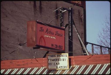 Keywords: A CAR BATTERY OPERATED THIS NEON ADVERTISING SIGN OVER A BUSINESS, DURING THE ENERGY CRISIS IN DECEMBER, 1973 - NARA - 555439.jpg Scope and content General notes 555439 Local identifier 412-DA-12987 Environmental Protection Agency 12/02/1970 - NARA-Author Falconer David Photographer 1427627 <br /> Portland Or 4202528 45 517 -122 67 <br /> Still Picture Records Section Special Media Archives Services Division NWCS-S National Archives at College Park 8601 Adelphi Road College Park MD 20740-6001 12/1973 Record group Record Group 412 Records of the Environmental Protection Agency 1944 - 2006 Record group ARC 708 DOCUMERICA The Environmental Protection Agency's Program to Photographically Document Subjects of Environmental Concern compiled 1972 - 1977 Series ARC 542493 File unit File unit ARC Variant control numbers Agency-Assigned Identifier 217/27/012987<br /> NAIL Control Number NWDNS-412-DA-12987 Other versions <gallery> File A_CAR_BATTERY_OPERATED_THIS_NEON_ADVERTISING_SIGN_OVER_A_BUSINESS _DURING_THE_ENERGY_CRISIS_IN_DECEMBER _1973_-_NARA_-_555439 tif tif File A_CAR_BATTERY_OPERATED_THIS_NEON_ADVERTISING_SIGN_OVER_A_BUSINESS _DURING_THE_ENERGY_CRISIS_IN_DECEMBER _1973_-_NARA_-_555439 jpg jpg </gallery> NARA-cooperation PD-USGov 1973 signs |