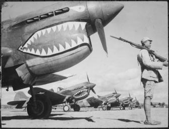 | Keywords: A Chinese soldier guards a line of American P-40 fighter planes, painted with the shark-face emblem of the "Flying... - NARA - 535531.tif A Chinese soldier guards a line of American P-40 fighter planes painted with the shark-face emblem of the Flying Tigers at a flying field somewhere in China The American pursuit planes have a 12-to-1 victory ratio over the Japanese Scope and content General notes Use War and Conflict Number 1149 when ordering a reproduction or requesting information about this image 535531 Local identifier 208-AA-12X 21 Office for Emergency Management Office of War Information Overseas Operations Branch New York Office News and Features Bureau 12/17/1942 - 09/15/1945 Still Picture Records Section Special Media Archives Services Division NWCS-S National Archives at College Park 8601 Adelphi Road College Park MD 20740-6001 ~ 1942 Record group Record Group 208 Records of the Office of War Information 1926 - 1951 Record group ARC 535 Photographs of the Allies and Axis compiled 1942 - 1945 Series ARC 535523 File unit File unit ARC Variant control numbers Former ARC Identifier 535530<br /> NAIL Control Number NWDNS-208-AA-12X 21 <br /> Other Identifier WWII Select List Number 68 yes Other versions NARA-cooperation PD-USGov Military aircraft of the Second Sino-Japanese War Nose art on P-40 Teeth in art Military uniforms of China Leggings Footwear China Air Task Force 23d Fighter Group United States Army Air Forces Sharks on aircraft War paint NARA TIF images with categorized JPGs |