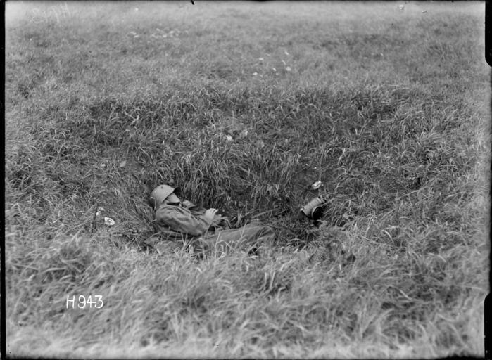 | Keywords: the great war thegreatwar great war greatwar world war one worldwarone world war i worldwari wwi first world war firstworldwar killed in action killedinaction kia war dead wardead german army germanarmy soldier stahlhelm blackandwhite monochrome outdoor black and white A German soldier lays dead in a shell hole during the attack on Grevillers, France during World War I. Photograph taken 24 August 1918 by Henry Armytage Sanders. Inscriptions: Inscribed - Photographer's title on negative -bottom left: H943. Quantity: 1 b&w original negative(s). Physical Description: Dry plate glass negative 4 x 5 inches A dead German soldier in a shell hole on the Western Front, World War I. Royal New Zealand Returned and Services' Association :New Zealand official negatives, World War 1914-1918. Ref: 1/2-013517-G. Alexander Turnbull Library, Wellington, New Zealand. natlib.govt.nz/records/22791416 A German soldier lays dead in a shell hole during the attack on Grevillers, France during World War I. Photograph taken 24 August 1918 by Henry Armytage Sanders. Inscriptions: Inscribed - Photographer's title on negative -bottom left: H943. Quantity: 1 b&w original negative(s). Physical Description: Dry plate glass negative 4 x 5 inches A dead German soldier in a shell hole on the Western Front, World War I. Royal New Zealand Returned and Services' Association :New Zealand official negatives, World War 1914-1918. Ref: 1/2-013517-G. Alexander Turnbull Library, Wellington, New Zealand. natlib.govt.nz/records/22791416 |