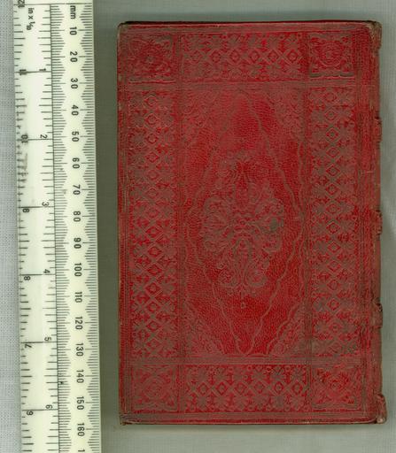 Keywords: A declaration of Christe and of his offyce - Lower cover (C28a13).jpg Style Panel design Centre and cornerpiece made of small tools; Caption Lower cover; Colour Red; Edge Gilt exhibition history Decorative Technique Tooled in blind; Cover Material Goatskin includes morocco turkey etc 3 spine bands top and tail band on spine Edges of boards tooled in gold around corners Blue ribbon marker Green/brown endleaves With the bookplate of Aubrey Townsend and ms note relating how the book was once in the possession of 'the bibliographer Herbert' the Duke of Roxburgh John Wilkes MP object history Text 1547; Unspecified; Unspecified object type Cc-zero place of creation Binding England place of discovery Unspecified British Library image http //www bl uk/catalogues/bookbindings/LargeImage aspx RecordId 020-000015031 ImageId ImageId 54444 Copyright BL A declaration of Christe and of his offyce Uploaded with GWToolset A declaration of Christe and of his offyce - Lower cover C28a13 http //www webarchive org uk/bldatasets/bindings/c28a13 jpg 19th-century bookbinding Bookbinding British Library Bookbindings |