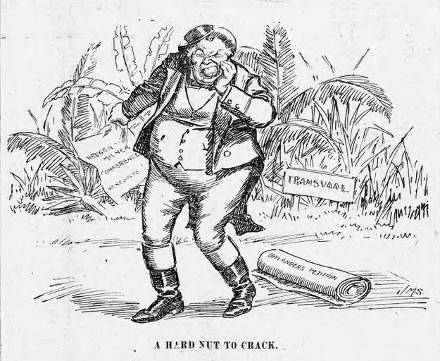 | Keywords: A Hard Nut to Crack - JM Staniforth.png Political cartoon by JM Staniforth showing John Bull the national personification of Great Britain struggling with the Uitlanders issue in Transvaal which would ultimatley lead to the Second Boer War http //papuraunewyddcymru llgc org uk/en/page/view/3286078 Evening Express Wales 1899-06-10 Jospeh Morewood Staniforth Cartoons by Joseph Morewood Staniforth John Bull 1899 in Wales Political cartoons of the United Kingdom Second Boer War in art 1890s political cartoons PD-old-70-1923 |