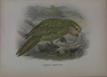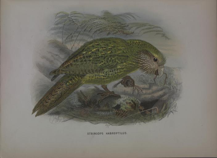 Keywords: A history of the birds of New Zealand (5692703951).jpg Order PSITTACI <br> Yam STKINGOPID <br> STEINGOPS HABROPTILUS <br> OWL PARROT <br> Strigops habro tilus Gray P Z S 1847 p 62 <br> Stringops hahroptilus Van der Hoeven Handb Zool ii p 466 1856 <br> Strigopsis hahroptilus Bonap Consp Gen Av i p 8 1850 <br> Strir/omis JiahroBtihis Schl Mns Pavs-Bas Psittaci r 107 1864 <br> Varieties <br> r <br> Strigops greyi Gray Ibis 1862 p 230 <br> Stringops grep Finsch Papag i p 253 1867 <br> Native names <br> Kakapo and Tarepo; Ground-Parrot of the colonists <br> Ad viridis plumis pilei dorsique medialiter pallide flavidis irregulariter nigricanti-brimneo transfasciatis et <br> transvermiculatis ; uropygii plumis Isetius viridescentibus loris plumisque rictum obtectentibus pallide <br> fulvescenti-brunneis medialiter albicantibus regione auriculari brunnea racliidibus plumarum fulve- <br> scentibus facie laterali brunnea plumis medialiter late flavicantibus remigibus nigricanti-brunneis <br> primariis extus et intixs flavicante maculatis secundariis irregulariter flavido fasciatim variis et extus <br> olivasccnti-viridi lavatis cauda olivascerLti-brunne ubique nigricante fasciolata subtiis magis flavicans <br> viridi lavatus abdomine puriiis flavicante pectoris plumis pauUo nigricante variis hypochondriis magis <br> conspicue fasciatis subalaribus olivascenti-flavis obscure brunneo fasciatis subalaribus flavicantibus <br> minoribus nigro variis rostro flavicanti-albido ad basin saturatiore pedibus flavicanti-brunneis <br> unguibus saturatioribus <br> Adult General colour of the upper surface dark sap-green brighter on the wings and lower part of back <br> and largely varied with dark brown and yellow; on their under surface the feathers of these parts are <br> light verditer-green towards the tip with a fine metallic lustre j on the crown and nape the centre of <br> each feather is blackish brown with a narrow shaft-line of dirty yellow and a broad terminal band of <br> dull green ; on the back rump and upper surface of the wings each feather is silvery brown at the <br> base pale lemon-yellow beyond changing to sap-green on the sides and towards the tip and crossed by <br> numerous broken bars and vermiculations of dark brown ; on the anterior portion of the back these bars <br> are regular and distinct but on the other parts they are interrupted by a broad shaft-line of lemon- <br> yellow These details of colouring however can only be observed when the plumage is disturbed the <br> general eff'ect on the surface being as already described The feathers at the base of the upper mandible <br> lores sides of face and feathers projecting over the lower mandible dull yellowish brown with darker <br> filaments; ear-coverts darker brown mixed with yellow; fore neck breast and sides of the body yel- <br> lowish sap-green varied with pale yellow and brown the distribution of colouring on each individual <br> feather being the same as on the upper parts but with more yellow down the shaft ; lower part of <br> abdomen thighs and under tail-coverts light greenish yellow the longer coverts obscurely barred with <br> bght brown; lining of wings pale lemon-yellow blotched and streaked with dark brown; primaries <br> dark brown largely toothed on their outer webs with dull lemon-yellow and on their inner with paler ; <br> J <br> –  J <br> A <br> I <br> k <br> <br> T <br> \ 34478700 107281 50671 Text http //www biodiversitylibrary org/page/34478700 1873 10 5962/bhl title 50671 Buller Walter Lawry; Keulemans J G NameFound Isetius viridescentibus NameFound Strigops NameConfirmed Strigops EOLID 39467 NameBankID 2473845 NameFound Strigops greyi NameFound Strigopsis NameConfirmed Strigopsis NameBankID 4356077 NameFound Stringops NameConfirmed Stringops NameBankID 23368 Biodiversity Heritage Library IUCN Red List Endangered and Critically Endangered Species Collection TWITTER POSTS Encyclopedia of Life Images taxonomy common kakapo taxonomy binomial Stringops habroptilus SpeciesOfTheDay taxonomy binomial stringops habroptilus speciesoftheday Information field Flickr posted date ISOdate 2011-05-06 PD-old-70-1923 A History of the Birds of New Zealand by Buller Photos uploaded from Flickr by Fæ using a script Files from the Biodiversity Heritage Library released as Attribution-NonCommercial-ShareAlike