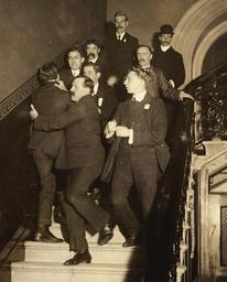 | Keywords: the women's library thewomenslibrary women suffrage politics hires monochrome 7JCC/O/02/068 Photograph, printed, paper, monochrome, a group of men on a staircase in the process of removing a male protestor; on reverse printed caption 'Wild Scenes at the City Temple: A determined suffragist demonstration was made at the City Temple last night (Thursday) when Mr Birrell, the chief secretary for Ireland, was repeatedly interrupted by a number of women who had to be ejected together with their men champions. Our picture taken at eight o'clock in the evening shows the 'throwing' out in active progress' and 'Copyright World's Graphic Press Limited, 36-38 Whitefriars Street, Fleet Street, London. Please Acknowledge' 7JCC/O/02/068 Photograph, printed, paper, monochrome, a group of men on a staircase in the process of removing a male protestor; on reverse printed caption 'Wild Scenes at the City Temple: A determined suffragist demonstration was made at the City Temple last night (Thursday) when Mr Birrell, the chief secretary for Ireland, was repeatedly interrupted by a number of women who had to be ejected together with their men champions. Our picture taken at eight o'clock in the evening shows the 'throwing' out in active progress' and 'Copyright World's Graphic Press Limited, 36-38 Whitefriars Street, Fleet Street, London. Please Acknowledge' |