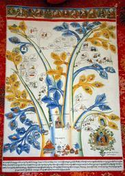 | Keywords: A Medical Thangka - Root of Treatment.jpg  en This painting illustrates a general overview of the treatment process as it is outlined in the Root Tantra Treatment can begin after humoural imbalance has been assessed through the diagnosis process tk 3 The four trunks of the tree from left to right correspond respectively to counsel on diet guidance on conduct appropriate medicinal treatments and external physical therapies For the sake of an example this presentation will go in-depth on counsel of diet and examine the role that the three humors play in this treatment The dietary trunk of the treatment thangka diverges into six blue yellow and white branches Each colour indicates the humoral imbalance to which it relates The blue branches correspond to food and drink which balance rlung wind These foods are generally oily and nutritious foods Seed oil garlic and human donkey marmot and horse flesh are some of foods shown in the rlung leaves The yellow branches depict food and drink to alleviate mkhris-pa bile imbalance Generally these foods are cool and light Fresh butter dandelion leaves and seeds warm water and goat veal and deer meat are all shown on the yellow leaves Finally the white leaves and branches illustrate food and drink for bad-kan phlegm imbalance which is rebalanced through the application of a warming diet Honey boiled water fish mutton and beast and yak meat are shown on the white leaves indicating their bad-kan balancing properties In total there are six branches with 35 leaves on the dietary trunk of the treatment tree each illustrating a food or drink used for rebalancing the humors Sources and Further Reading Averdon pg 110 Old pg 75-78 Gyurme Dorje Sangye Gyamtso 1653-1705 PD-old-100 Medical thangka from Tibet |