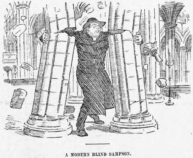 | Keywords: A Modern Blind Sampson - JM Staniforth.png en Political cartoon by JM Staniforth A Ritualist clergyman blinded by his faith threatens to bring down the pillars of the Church of England http //papuraunewyddcymru llgc org uk/en/page/view/3283108 Evening Express Joseph Morewood Staniforth 1899-02-14 Cartoons by Joseph Morewood Staniforth 1890s political cartoons Political cartoons of the United Kingdom 1899 in the United Kingdom Samson Church of England PD-old-70-1923 | ||||