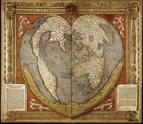 | Keywords: A Modern and Complete Map of the World by the Royal Mathematician Oronce Fine of the Dauphiné WDL4072.png Artwork ru Фине О онс 1494-1555 гг fr Fine Oronce 1494-1555 en Finé Oronce 1494-1555 zh 费恩 欧龙斯,1494-1555 年 pt Finé Oronce 1494-1555 ar أورانس فين، 1494 - 1555 es Fine Oronce 1494-1555 ru Сов еменная полная ка та ми а составленная ко олевским математиком О онсом Фине из Дофине fr Une carte moderne et complète du monde par le mathématicien royal Oronce Finé du Dauphiné en A Modern and Complete Map of the World by the Royal Mathematician Oronce Fine of the Dauphiné zh 多菲内皇家数学家欧龙斯·费恩绘制的现代版完整世界 图 pt Um mapa múndi moderno e completo pelo matemático real Oronce Finé de Delfinado ar خريطة حديثة وكاملة للعالم أنشأها عالم الرياضيات الملكي أورانس فين من أبناء مقاطعة دوفين ru Аст оном и математик с 1531 г возглавлявший кафед у математики в Ко олевском колледже в настоящее в емя Коллеж де Ф анс О онс Фине 1494 1555 гг был одним из пе вых ф анцузских ученых-ка тог афов Созданная им ка та ми а в фо ме се дца является одной из 18 ка т составленных в се дцевидной п оекции и изданных в пе иод с 1511-го по 1566-ой год Основанная на одной из п оекций описанных геог афом II в Птолемеем данная п оекция была п иведена в систему математиком из ю нбе га Йоханнесом Ве не ом 1468 1522 гг в сочинении написанном в 1514 г Ка та Фине от ажает состояние науки того в емени существовавшие геог афические гипотезы и неоп еделенности Севе ная Аме ика соединена с Азией а на юге изоб ажена ог омная <em>Terra Australis</em> Южная земля гипотетический континент кото ый по п едположениям геог афов должен был у авновешивать массу земель севе ного полуша ия Ка та находилась в коллекции геог афа Жана-Батиста Бу гиньона д'Анвиля 1697 1782 гг В 1779 г она была п иоб етена ко олем Людовиком XVI а в 1924 г пе едана на х анение в ациональную библиотеку Ф анции <br>Ка ты ми а fr Astronome et mathématicien titulaire dès 1531 de la première chaire de mathématique du Collège royal aujourd hui Collège de France Oronce Fine 1494-1555 est l un des premiers savants français à faire œuvre de cartographe Sa mappemonde en forme de cœur appartient à un groupe de 18 cartes en projection cordiforme éditées entre 1511 et 1566 Inspiré de l une des projections décrites par le cartographe du IIe siècle Ptolémée ce système de projection fut codifié par un mathématicien de Nuremberg Johannes Werner 1468-1522 dans un opuscule daté de 1514 La carte de Fine reflète les hypothèses et incertitudes de l époque en matière de géographie L Amérique du Nord est reliée à l Asie et une vaste <em>Terra Australis</em> continent imaginé que les géographes supposaient exister pour équilibrer le poids des masses terrestres septentrionales a été dessinée au sud Cette carte provient de la collection du géographe Jean-Baptiste Bourguignon d'Anville 1697-1782 Elle fut achetée par le roi Louis XVI en 1779 et déposée à la Bibliothèque nationale de France en 1924 <br>Cartes du monde en An astronomer and mathematician from 1531 the first chair of mathematics in the Collège Royal the present-day Collège de France Oronce Fine 1494 1555 was one of the first French scholars to work with cartography His world map in the shape of a heart belongs to a group of 18 heart-shaped projection maps published between 1511 and 1566 Inspired by one of the projections described by the second-century geographer Ptolemy this projection system was codified by a mathematician in Nuremberg Johannes Werner 1468 1522 in an opus written in 1514 Fine s map reflects the state of knowledge and the geographic hypotheses and uncertainties of its day North America is joined with Asia and a vast <em>Terra Australis</em> a hypothetical continent that geographers posited had to exist to counterbalance the weight of the northern land masses is drawn in the south The map is from the collection of the geographer Jean-Baptiste Bourguignon d'Anville 1697 1782 It was purchased by King Louis XVI in 1779 and deposited in the National Library of France in 1924 <br>World maps zh 欧龙斯·费恩(Oronce Fine,1494 1555 年)是 位的天文学家和数学家,1531 年担任巴黎皇家学院(今天的法兰西学院)的首任数学系主任,是法国 早从事 图制 的学 之 这幅由他制 的心形世界 图是 1511 和 1566年出版的 18 幅心形投影 图之 受到纽伦堡数学家约翰·维尔纳(Johannes Werner,1468 1522 年) 其 1514 年编写的 品其中 幅由 2 世纪 理学家托勒密 Ptolemy 制 的投影图的启发,费恩的这幅 图反映出当时的知识程度,以及 理学上的假设推测和不确定 北美洲与亚洲相连, 南方绘 个广阔的<em>南方大陆</em>,因为 理学家认为,必须存 这样 假设的大陆,才能平衡北方大陆的重量 这幅 图是属于 理学 让-巴蒂斯特·昂维尔(Jean-Baptiste Bourguignon d'Anville,1697 1782 年)的收藏品,1779 年被国王路易十六世 Louis XVI 购得,1924 年