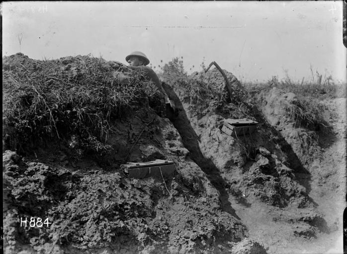 Keywords: blackandwhite monochrome outdoor photo border black and white A New Zealand sentry stands in an enclave dug into a trench wall in the front line at Gommecourt Wood during the second Somme campaign, World War I. The soldier's helmeted head is just above ground level. Photograph taken 10 August 1918 by Henry Armytage Sanders. Inscriptions: Inscribed - Photographer's title on negative -bottom left: H884. Quantity: 1 b&w original negative(s). Physical Description: Dry plate glass negative 4 x 5 inches A New Zealand sentry in the front line, Gommecourt Wood, France. Royal New Zealand Returned and Services' Association :New Zealand official negatives, World War 1914-1918. Ref: 1/2-013461-G. Alexander Turnbull Library, Wellington, New Zealand. natlib.govt.nz/records/22784004 A New Zealand sentry stands in an enclave dug into a trench wall in the front line at Gommecourt Wood during the second Somme campaign, World War I. The soldier's helmeted head is just above ground level. Photograph taken 10 August 1918 by Henry Armytage Sanders. Inscriptions: Inscribed - Photographer's title on negative -bottom left: H884. Quantity: 1 b&w original negative(s). Physical Description: Dry plate glass negative 4 x 5 inches A New Zealand sentry in the front line, Gommecourt Wood, France. Royal New Zealand Returned and Services' Association :New Zealand official negatives, World War 1914-1918. Ref: 1/2-013461-G. Alexander Turnbull Library, Wellington, New Zealand. natlib.govt.nz/records/22784004 |