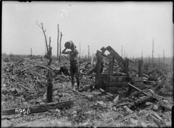 | Keywords: blackandwhite monochrome outdoor photo border black and white A New Zealand soldier drinking from a bucket of well water in the ruins of the French village of Puisieux. Another soldier looks on. Apart from the well which remains functioning, everything else has been destroyed. Photograph taken late August 1918 by Henry Armytage Sanders. Inscriptions: Inscribed - Photographer's title on negative -bottom left: H968. Quantity: 1 b&w original negative(s). Physical Description: Dry plate glass negative 4 x 5 inches A New Zealand soldier drinks from a well in ruined Puisieux, World War I. Royal New Zealand Returned and Services' Association :New Zealand official negatives, World War 1914-1918. Ref: 1/2-013537-G. Alexander Turnbull Library, Wellington, New Zealand. natlib.govt.nz/records/22806795 A New Zealand soldier drinking from a bucket of well water in the ruins of the French village of Puisieux. Another soldier looks on. Apart from the well which remains functioning, everything else has been destroyed. Photograph taken late August 1918 by Henry Armytage Sanders. Inscriptions: Inscribed - Photographer's title on negative -bottom left: H968. Quantity: 1 b&w original negative(s). Physical Description: Dry plate glass negative 4 x 5 inches A New Zealand soldier drinks from a well in ruined Puisieux, World War I. Royal New Zealand Returned and Services' Association :New Zealand official negatives, World War 1914-1918. Ref: 1/2-013537-G. Alexander Turnbull Library, Wellington, New Zealand. natlib.govt.nz/records/22806795 |