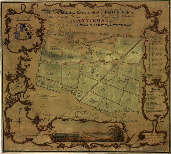 | Keywords: A Plan of the Estate Called Jonas's Situated in the Division of North Sound in the Island of Antigua, the Property of Peter Langford Brooke, Esquire WDL647.png Artwork ru Бейке Джеймс Х fr Baker James H en Baker James H zh 克 詹姆斯·H pt Baker James H ar بيكر جيمس ه es Baker James H ru План поместья над названием Ионас асположенного на севе о-восточном участке ост ова Антигуа владение Пите а Лэнгфо да Б ука эсквай а fr Plan du domaine Jonas se trouvant dans la partie Nord de l'île d'Antigua résidence de Peter Langford Brooke Esquire en A Plan of the Estate Called Jonas's Situated in the Division of North Sound in the Island of Antigua the Property of Peter Langford Brooke Esquire zh 安提 岛北湾 区的乔纳斯之家平 图,彼得·兰福德·布鲁克先生的房产 pt Uma Planta da Propriedade chamada Jonas situada na Divisão do Canal Norte na Ilha de Antigua Propriedade de Peter Langford Brooke Advogado ar رسم تخطيطي للعزبة المسماة جوناس والواقعة في جزء اللسان البحري الشمالي في جزيرة أنتيغوا، ملك بيتر لانغفورد بروك المحترم ru В колониальный пе иод в собственности семейства Лэнгфо д Б ук из чеши ской де евни иэ Англия находилось несколько объектов на ост ове Антигуа а этой ка те 1821 года изоб ажено поместье Джонас В п авой части ка ты п иводятся сведения о наделах земли отведенных для вы ащивания саха ного т остника и д угих целей а также дается ключ к ст оениям плантации включавшим вет яную мельницу котельную сушильное отделение пог еб для ома комнаты смот ителя дом для больных помещение для заготовок большой дом и офис загоны для мулов и скота а соп оводительном плане составленном тем же топог афом более под обно изоб ажены п оизводственные блоки и ст оения поместья Пе выми жителями Антигуа была на одность сибоней позднее здесь п оживали а аваки и индейцы-ка ибы Х истофо Колумб был пе вым ев опейцем ступившим на ост ов в 1493 году и назвал его Санта- а ия-де-ла-Антигуа В 1632 году б итанцы основали на Антигуа колонию и начали ввозить большое количество абов из Аф ики для аботы на плантациях саха ного т остника В 1834 году абы получили свободу однако многие из бывших абов остались аботать на плантациях В 1981 году Антигуа об ела независимость став частью госуда ства Антигуа и Ба буда <br>Плантации fr Pendant la période coloniale la famille de Brooke Langford de Mere dans le Cheshire en Angleterre possédait plusieurs propriétés sur l'île d'Antigua Cette carte de 1821 montre le domaine Jonas Les références sur la droite apportent des informations sur la part des terres consacrées à la production de canne à sucre et à d'autres utilisations ainsi qu'une indication relative aux structures de la plantation qui comprenaient le moulin à vent la chaufferie le séchoir la cave à rhum les chambres pour les surveillants l'infirmerie et la chambre de repos la maison de maitre et des bureaux ainsi que des enclos pour les mules et les bovins Un plan de terrain en annexe préparé par le même géomètre décrit plus en détail les travaux et les bâtiments Les premiers habitants d'Antigua étaient issus du peuple Siboney suivis d'Indiens Arawaks et Caraïbes En 1493 Christophe Colomb fut le premier Européen à visiter l'île Il l'a baptisée Santa Maria de la Antigua En 1632 les Britanniques y établirent une colonie et commencèrent à faire venir un grand nombre d'esclaves d'Afrique pour travailler sur les plantations de canne à sucre Les esclaves furent affranchis en 1834 mais de nombreux anciens esclaves ont continué à travailler sur les cultures de canne à sucre En 1981 Antigua est devenue indépendante en tant que partie d'Antigua-et-Barbuda <br>Plantations en In the colonial period the Langford Brooke family of Mere in Cheshire England owned several properties on the island of Antigua This map from 1821 shows the Jonas estate The references at the right provide information about the shares of land devoted to growing sugar cane and to other uses as well as a key to the plantation s structures which included the windmill boiling house curing house rum cellar the overseer s rooms the sick house and laying-in room the great house and offices and pens for mules and cattle An accompanying ground plan produced by the same surveyor depicted the estate s works and buildings in more detail Antigua s earliest inhabitants were the Siboney people followed by Arawak and Carib Indians The first European to visit the island was Christopher Columbus in 1493 who named it Santa Maria de la Antigua In 1632 the British established a colony on Antigua and began importing large numbers of slaves from Africa to work on its sugar cane plantations The slaves were freed in 1834 but many former slaves continued to work on the sugar plantations In 1981 Antigua became independent as part of the country of Antigua and
