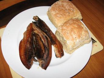 Keywords: A plate of smoked kippers.JPG en Smoked kippers Craster UK 2005-09-21 14 46 27 own PookieFugglestein cc-zero Uploaded with UploadWizard Kippers Northumberland Fish-based food