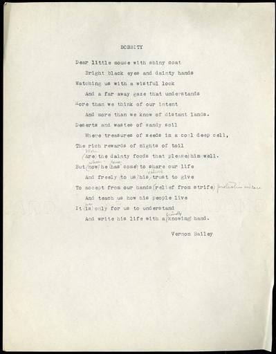 | Keywords: smithsonian institution smithsonianinstitution smithsonian institution archives smithsonianinstitutionarchives poem zoological scientific poetry draft 2012_11 201211 document text monochrome writing Creator: Vernon Orlando Bailey Local number: SIA2011-1523 Summary: "A poem about "Bobbity", a Perognathus pacificus (pocket mouse), written by Vernon Orlando Bailey. Dates: circa 1889-1941 Collection: RU 007267, Vernon Orlando Bailey Papers, 1889-1941 and undated, Box 7, Folder 46. Repository: Smithsonian Institution Archives Related blog post: Mammalogy at the Intersection of Mercy and Truth View more collections from the Smithsonian Institution.. Creator: Vernon Orlando Bailey Local number: SIA2011-1523 Summary: "A poem about "Bobbity", a Perognathus pacificus (pocket mouse), written by Vernon Orlando Bailey. Dates: circa 1889-1941 Collection: RU 007267, Vernon Orlando Bailey Papers, 1889-1941 and undated, Box 7, Folder 46. Repository: Smithsonian Institution Archives Related blog post: Mammalogy at the Intersection of Mercy and Truth View more collections from the Smithsonian Institution.. |